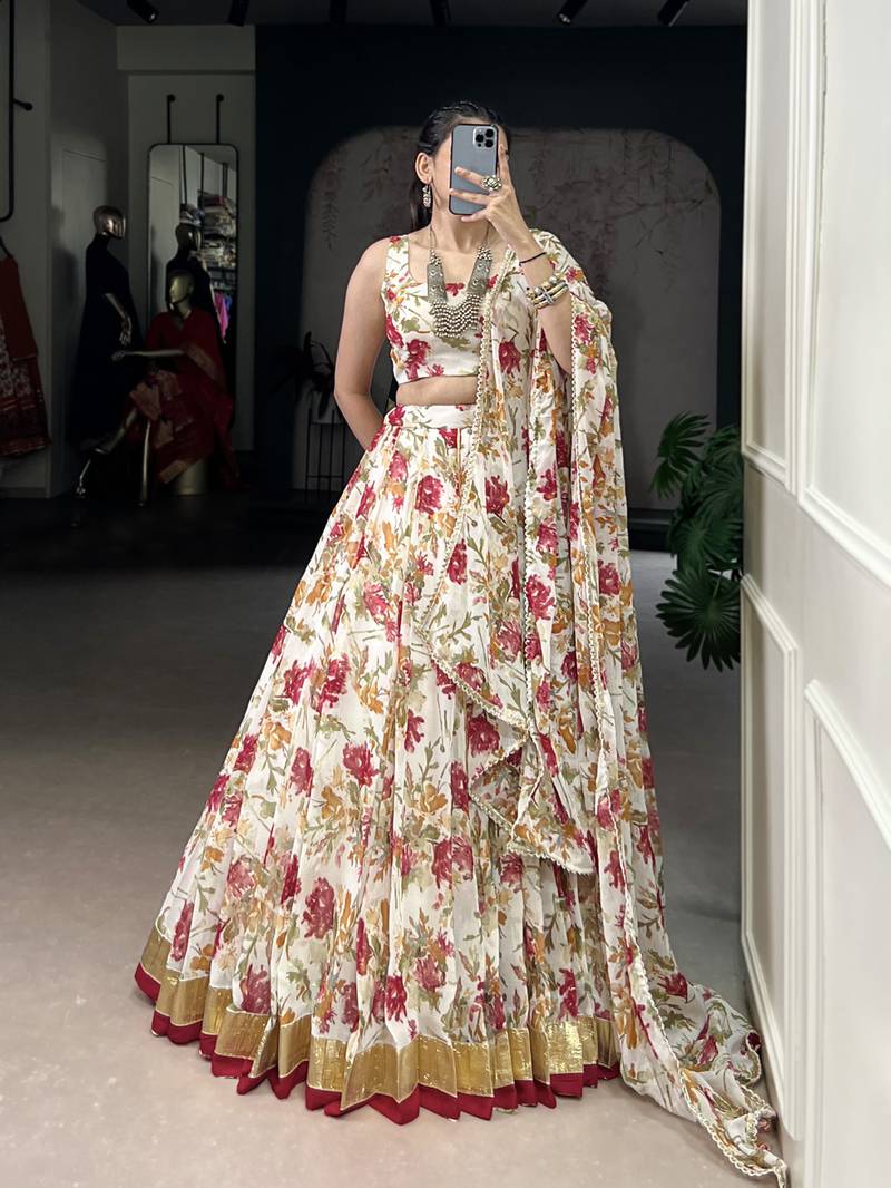 White Printed Chiffon Ethnic Lehenga Choli With Dupatta