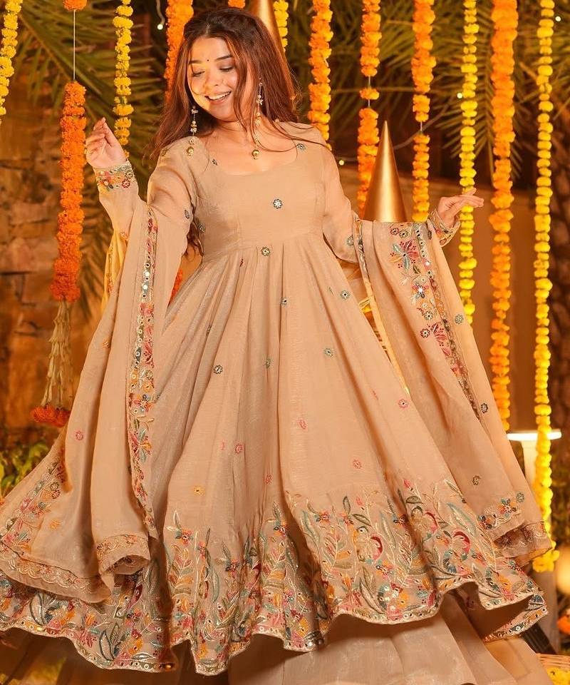 • Product Id : 4704105 • Package Details : 1 Top/1 Bottom /1 Dupatta • Type : Anarkali Suit • Work : Embroidered • Type : Banarasi Silk • Look : Fashion • Sleeve : Half Sleeve • Neck Style : V Neck • Fabric : Silk • Color : Chiku • Stitching : Stitched Payments [+]