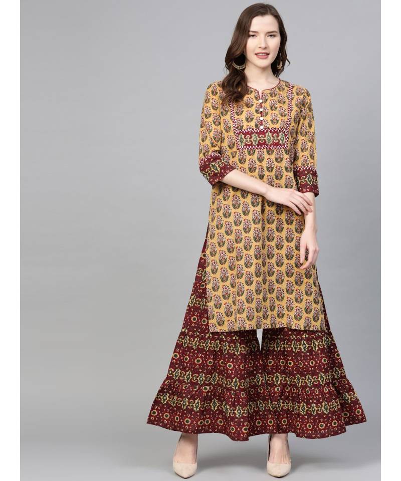 Cotton Floral Printed Straight Kurta & Sharara Set Mustard