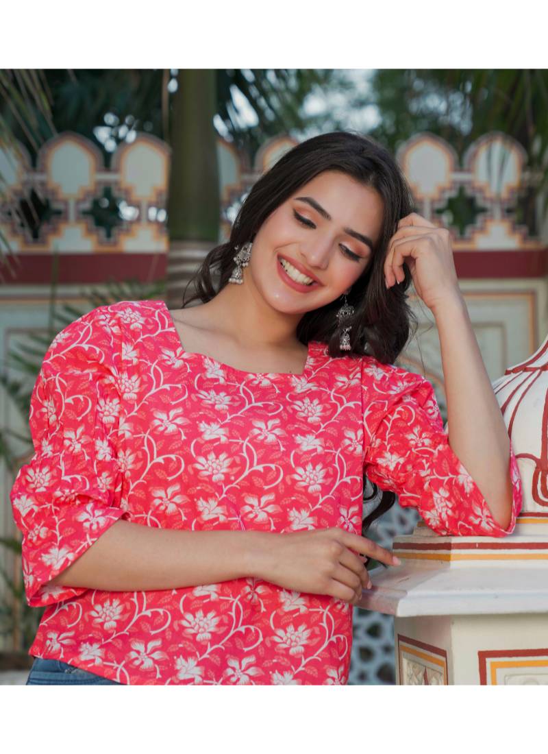 This casual pink floral print top features a soft pure cotton fabric that’s breathable and comfortable for daily wear. It has a stylish square neckline and layered 3/4 sleeves that add a trendy touch. The regular fit makes it easy to style with jeans, trousers, or skirts for a chic casual look. The cheerful floral pattern gives it a fresh, feminine appeal perfect for everyday outings. Lightweight and versatile, it’s a great pick for casual wear or weekend plans.