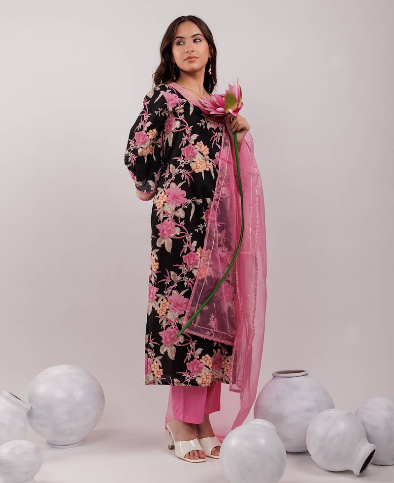 Black Floral Print Cotton Straight Kurta Trouser With Dupatta Set
