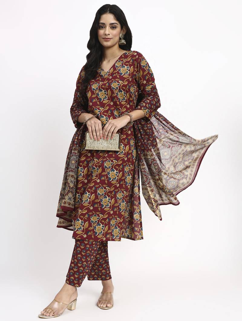 • Product Id : 4711930 • Package Details : 1 Kurta,1 Trousers,1 Dupatta • Type : Kurta Sets • Work : Printed • Type : Floral Print • Look : Traditional • Sleeve : Quarter Sleeve • Neck Style : V Neck • Color : Burgundy • Fabric : Pure Cotton • Stitching : Stitched • Length : 46.0 • Side Slit : Yes Payments [+]