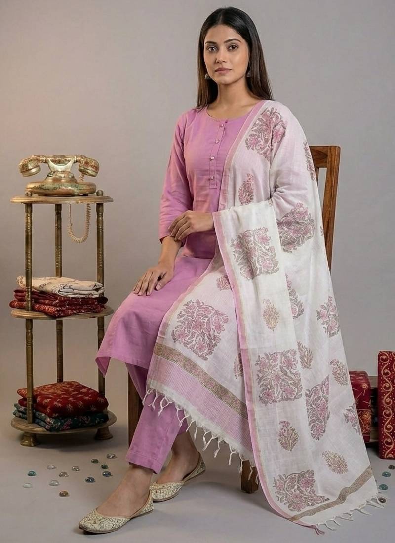 Step into easy summer elegance with this mouve straight-fit viscose-silk kurta, paired with a handcrafted hand-block printed dupatta. Soft, flowy, and refined — perfect for daily wear, office, and festive occasions.