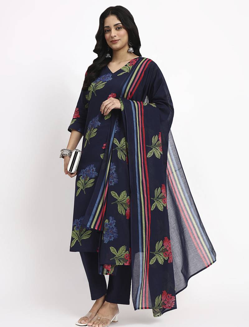 • Product Id : 4711928 • Package Details : 1 Kurta,1 Trousers,1 Dupatta • Type : Kurta Sets • Work : Printed • Type : Floral Print • Look : Traditional • Sleeve : Quarter Sleeve • Neck Style : V Neck • Color : Navy Blue • Fabric : Pure Cotton • Stitching : Stitched • Length : 46.0 • Side Slit : Yes Payments [+]
