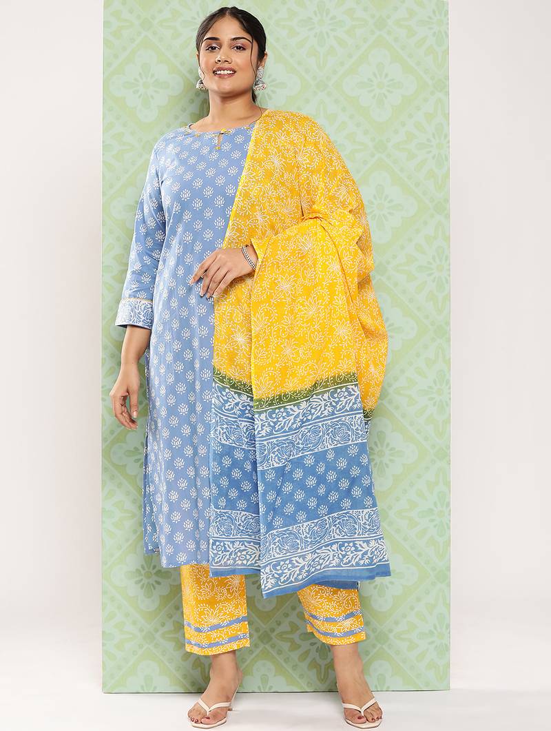 Blue and yellow printed Kurta with Trousers with dupatta Kurta design: Ethnic motifs printed Straight shape Regular style Round neck, three-quarter regular sleeves 1 pockets Calf length with straight hem Pure cotton machine weave fabric Trousers design: Printed Trousers Elasticated waistband Slip-on closure Dupatta design: Printed dupatta Material & Care 100% Cotton Hand wash
