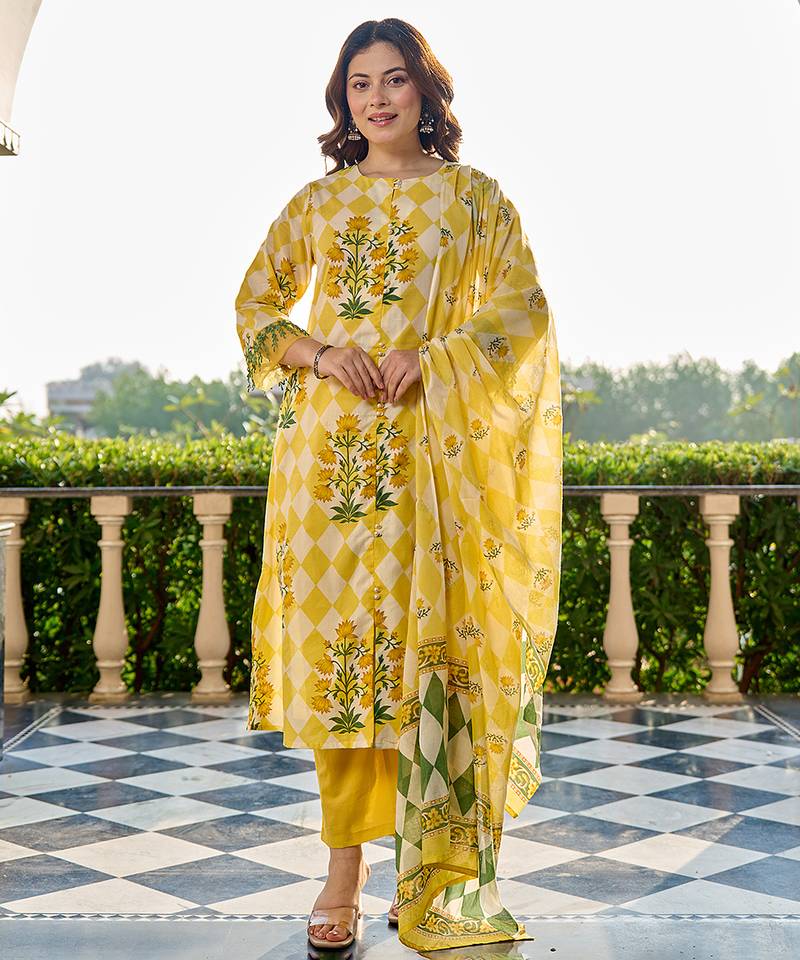 Yellow And White Floral And Geometric A-line Button yoke design Kurta Trouser Dupatta Set Kurta Design A-line Shape Multi Slits Three quarter Regular Sleeves Round neck Calf Length kurta Flared Him Machine Weave Pure cotton Trouser Design: Yellow Solid Trouser Elastic waist Dupatta Yellow Pure cotton Printed Border Size & Fit Material & Care Pure cotton Dry Clean