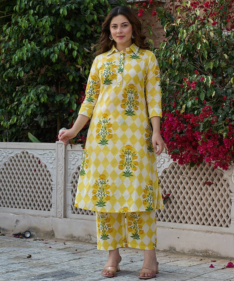 Yellow And White Floral And Geometric Straight Button yoke design Kurta Trouser Set Kurta Design Straight Shape Side Slits Three quarter Regular Sleeves Shirt Collar Calf Length kurta Flared Him Machine Weave Pure cotton Trouser Design: Yellow Printed Trouser Elastic waist Size & Fit Material & Care Pure cotton Dry Clean