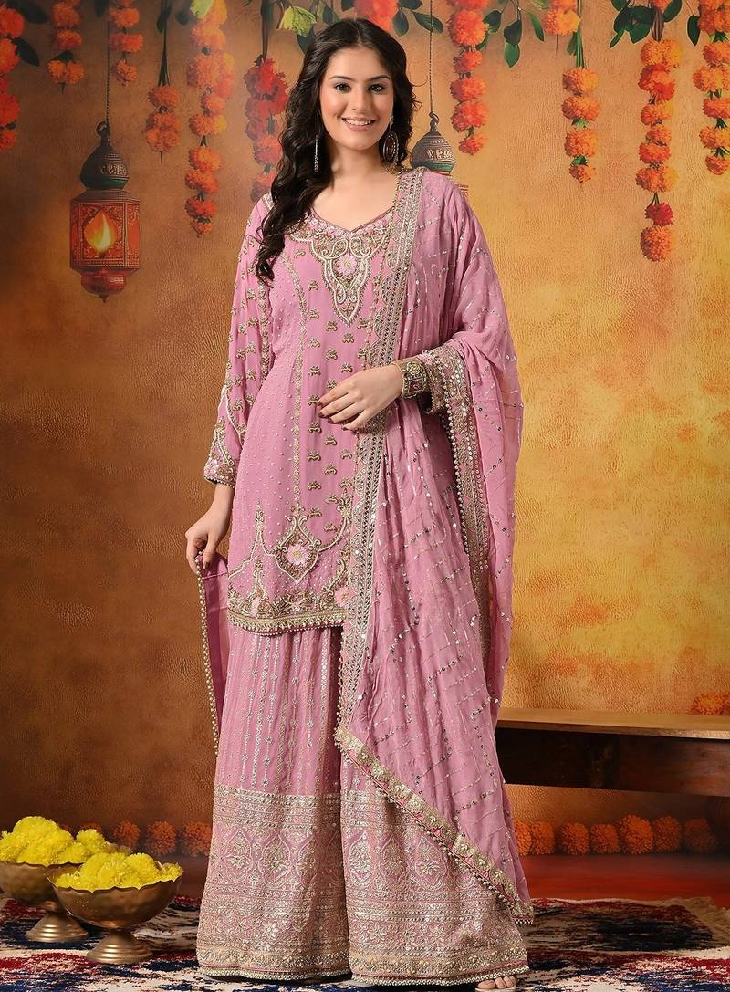 Pink Georgette Embroidered Gharara Set Stitched